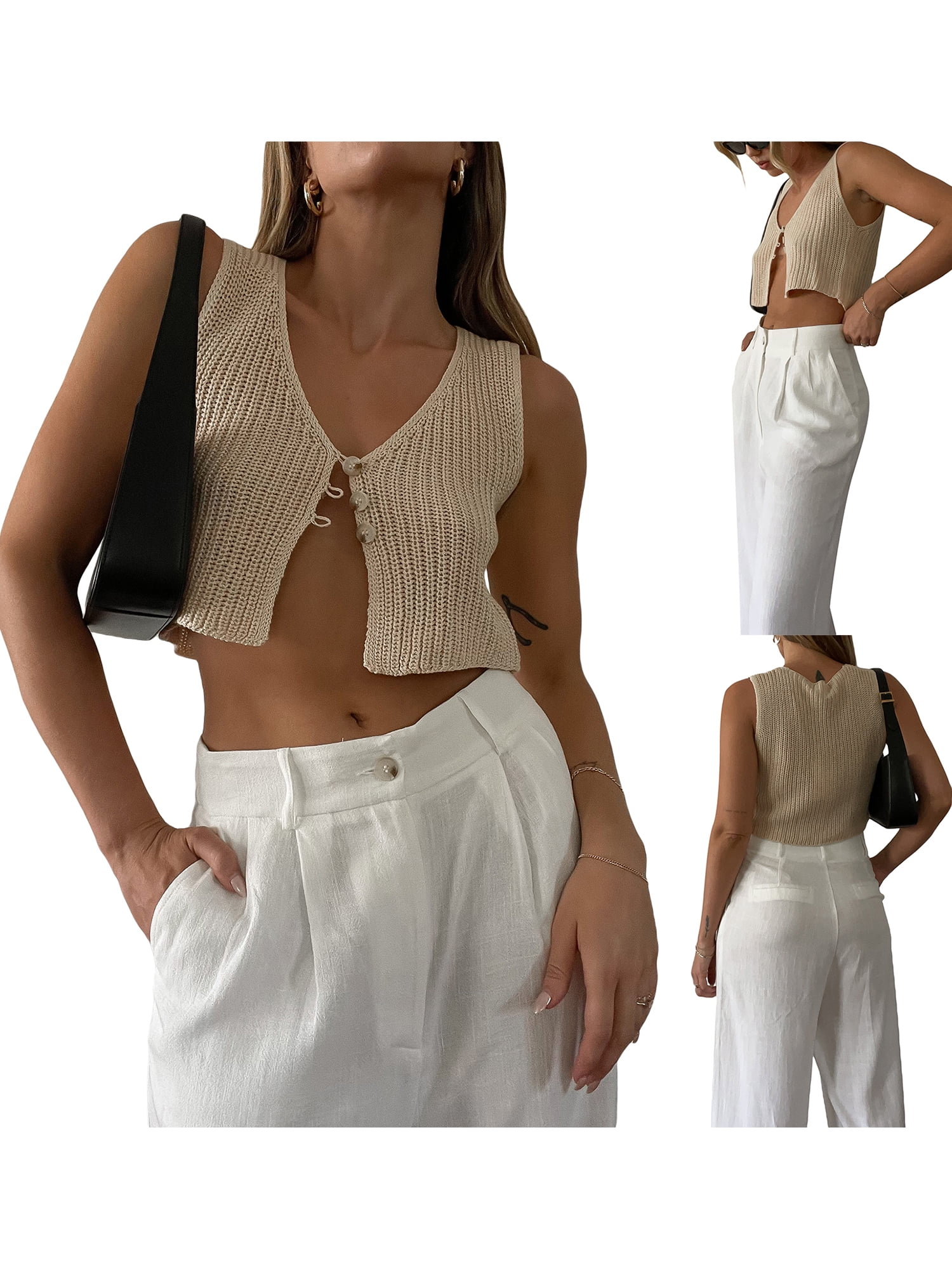 Women Crochet Knit Vest Solid Hollow Out Button Down V Neck Sleeveless Crop Tops Vintage Casual Versatile Streetwear Walmart Com